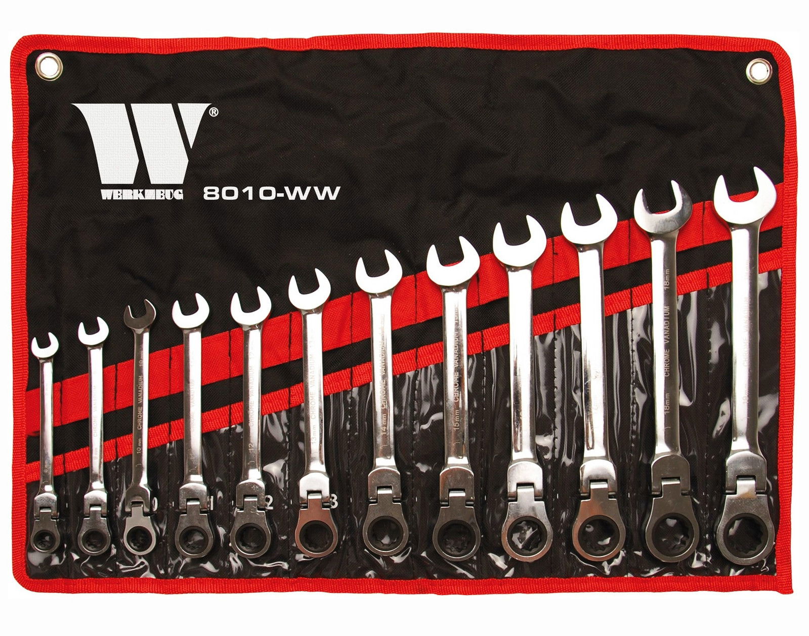 Welzh Werkzeug 8010-WW csillag-villáskulcs készlet, 72-fogú racsnis-csuklós, metrikus, 12 részes