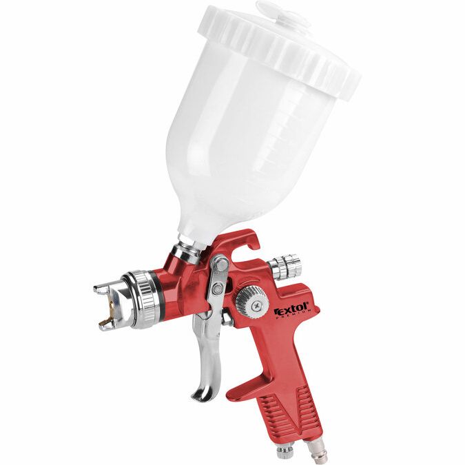 600ml-es műanyag tartállyal rendelkezik a festékszóró. Vízbázisú és higítós festékekhez. Ennél festékszórónál kisebb a magasnyomású típusokra jellemző fröccsenés. Az alacsony nyomáson kedvezőbb a festéktapadás. Rozsdamentes fuvóka és tű a vizes bázisú festékek miatt.