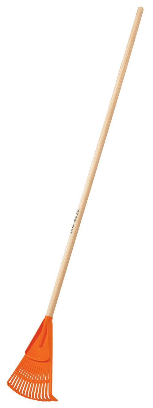 Műanyag lombseprű (narancs), 15 ágú, 20 cm széles fej, 122 cm hosszú fa nyél