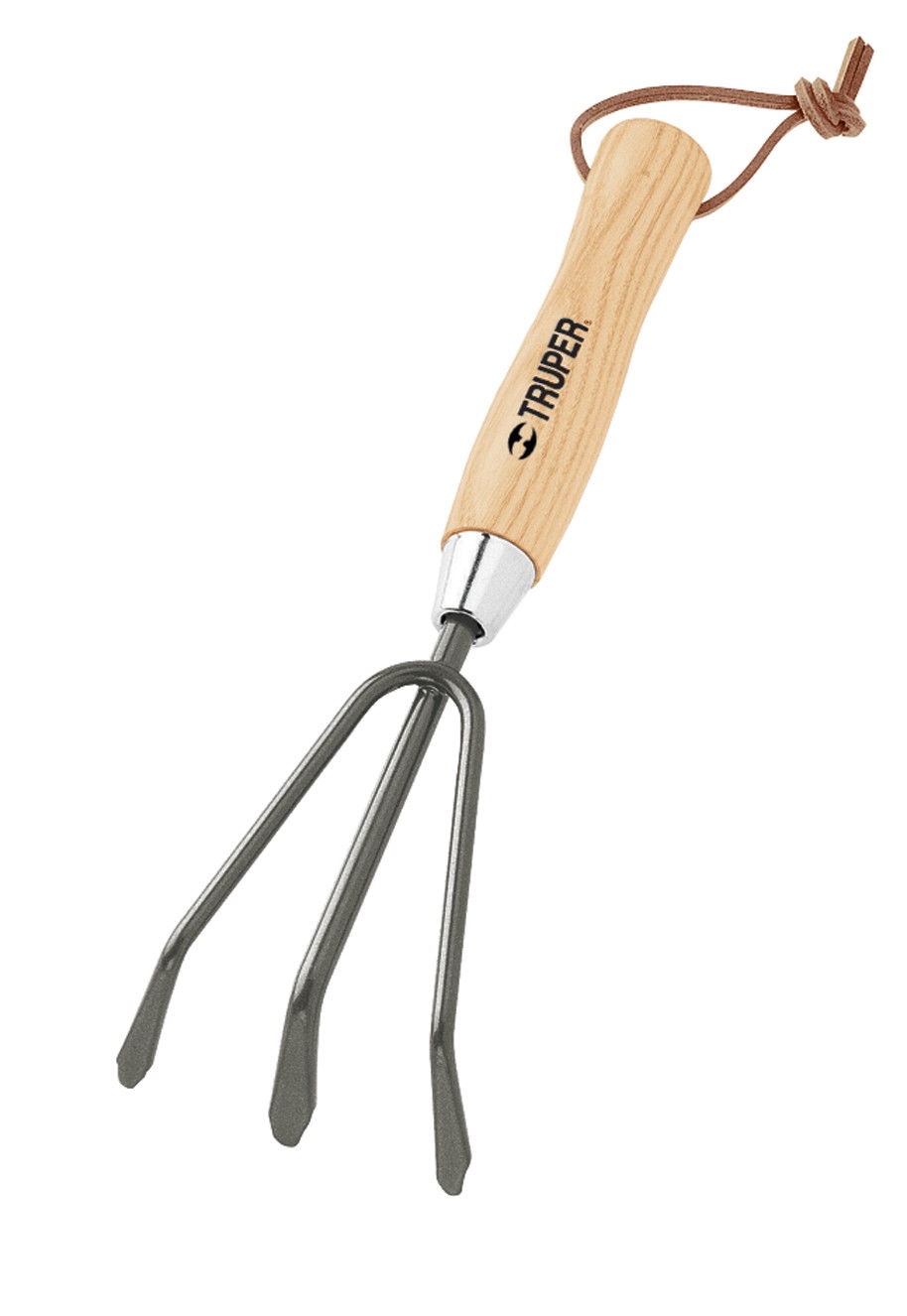 Kis földlazító, 29 cm hosszú, 3 fogú, 15 cm hosszú lakkozott fa nyél, bőr akasztóval