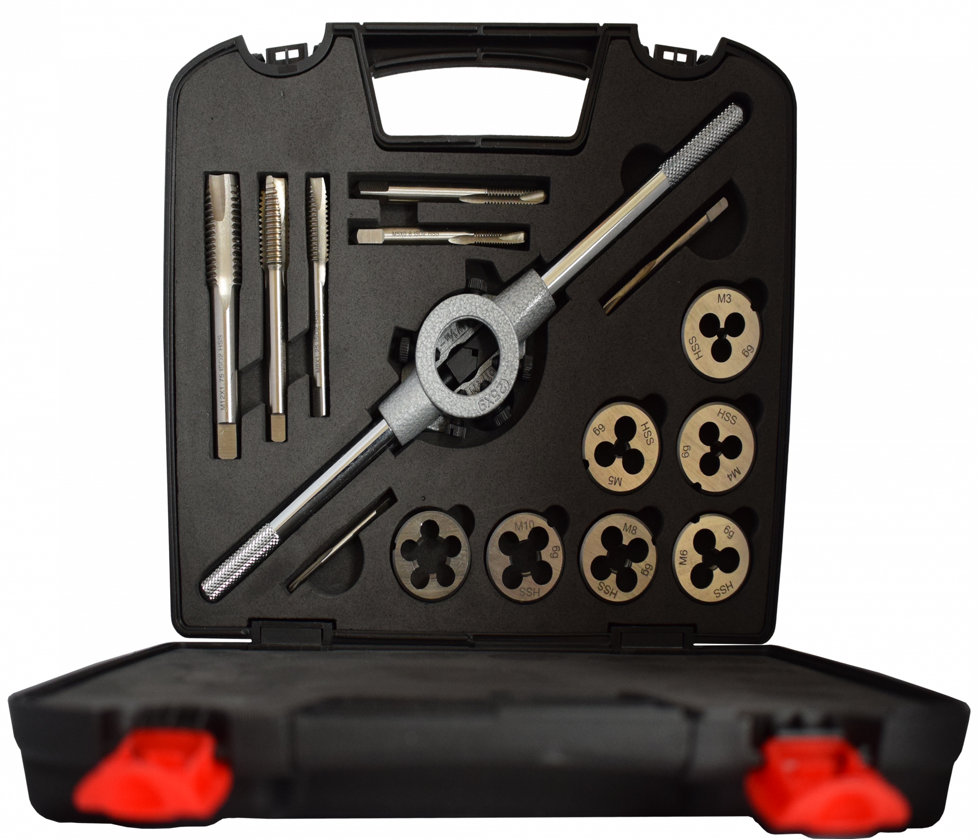1 db M3 x 0,6, 1 db M4 x 0,7, 1 db M5 x 0,8, 1 db M6 x 1,0, 1 db M8 x 1,25, 1 db M10 x 1,5, 1 db M12 x 1,75 1 db hajtóvas menetmetszőhöz 25x9 1 db hajtóvas kézi menetfúróhoz 11/2 méret M1-M12