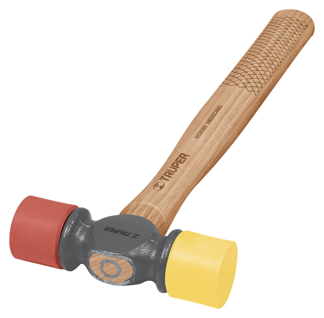 Kalapács 0,39kg,műanyag(sárga) és gumi(piros) fej,405mm lakkozott fa nyél