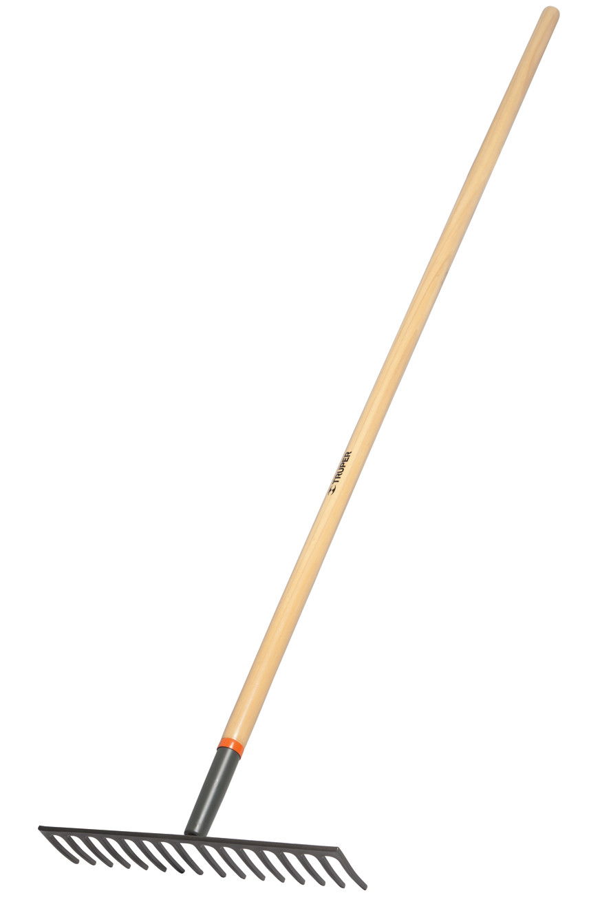 Gereblye, 42 cm széles egyenes fej, 16 fog, 153 cm hosszú lakkozott fa nyél