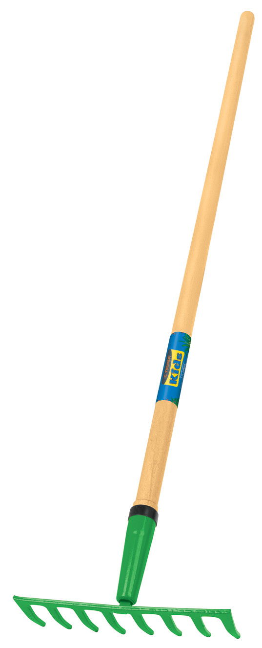 Gereblye, 10 cm széles fej, 8 fog, 107 cm hosszú lakkozott fa nyél, gyerekeknek