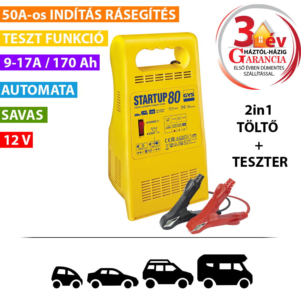 Indítás rásegítés: ha az akkumulátor lemerült, a START UP 80 lehetőséget biztosít néhány perc alatt kisebb járművek elindítására, mindössze néhány perces (17 A-es) előtöltés mellett, BOOST állásba 50 A-os indító árammal.