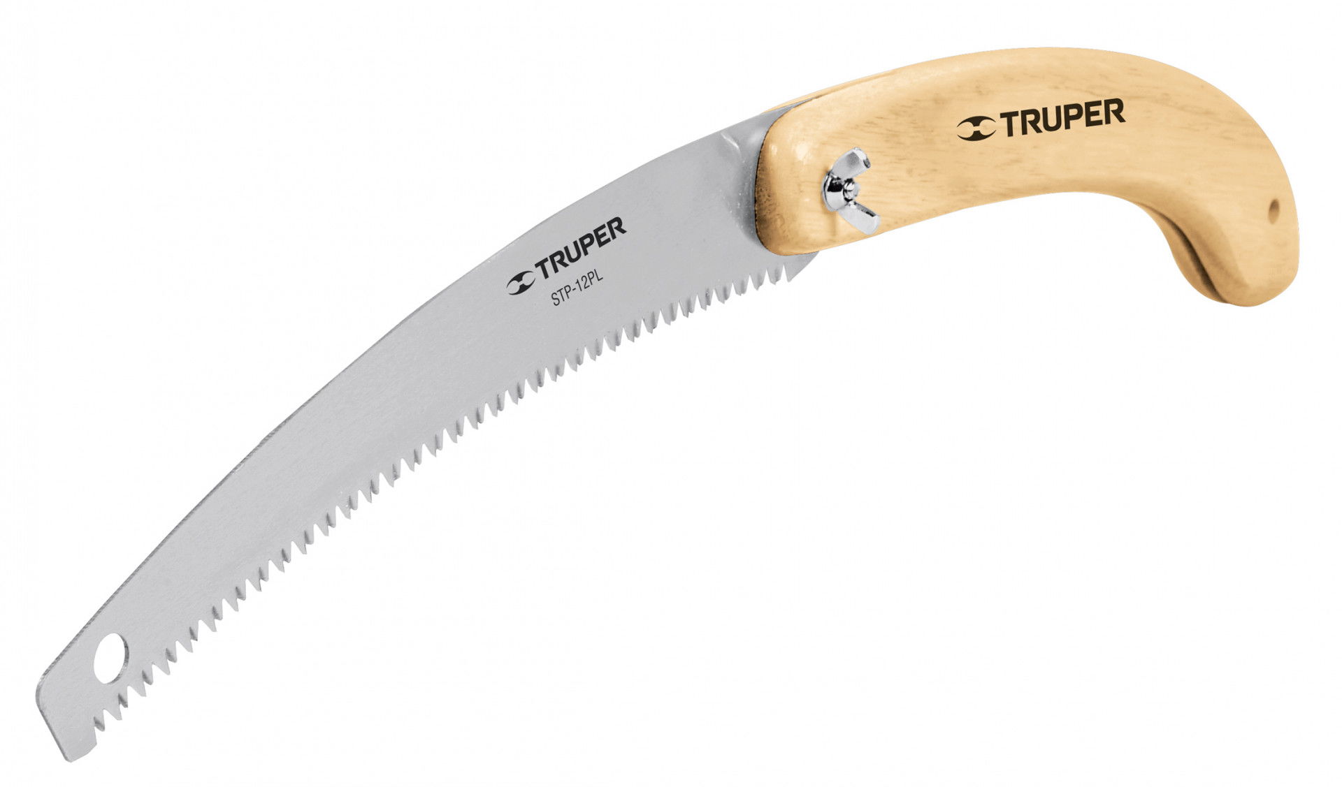 Bicskafűrész, hármas fogazatú penge, SK-5acél, lakkozott összecsukható fa nyél