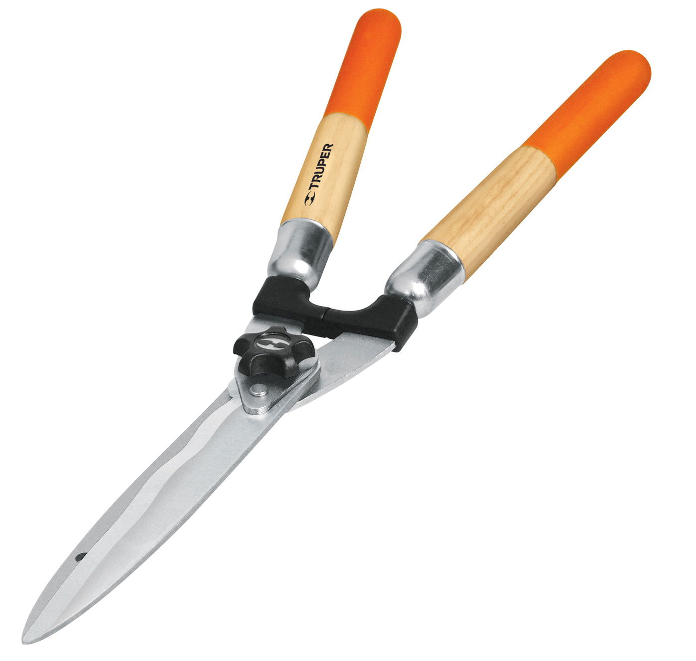 Sövénynyíró olló, 59 cm hosszú, feszítőerő szabályozó gomb, gumis markolat, hullámos él